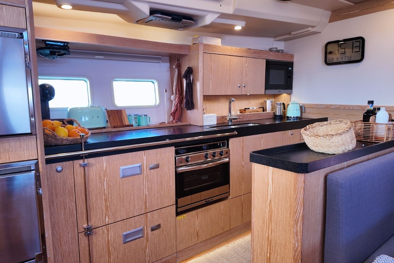 From her Elvstrom Blue Water Runner and storm sail to a thoughtfully outfitted interior including a wine cooler and full galley upgrades, she’s been prepared for long-range cruising in comfort. Power and control come from the Volvo Penta D3-110 with retractable bow and stern thrusters, while electric halyard winches, water maker, and upgraded generator support independence at sea.