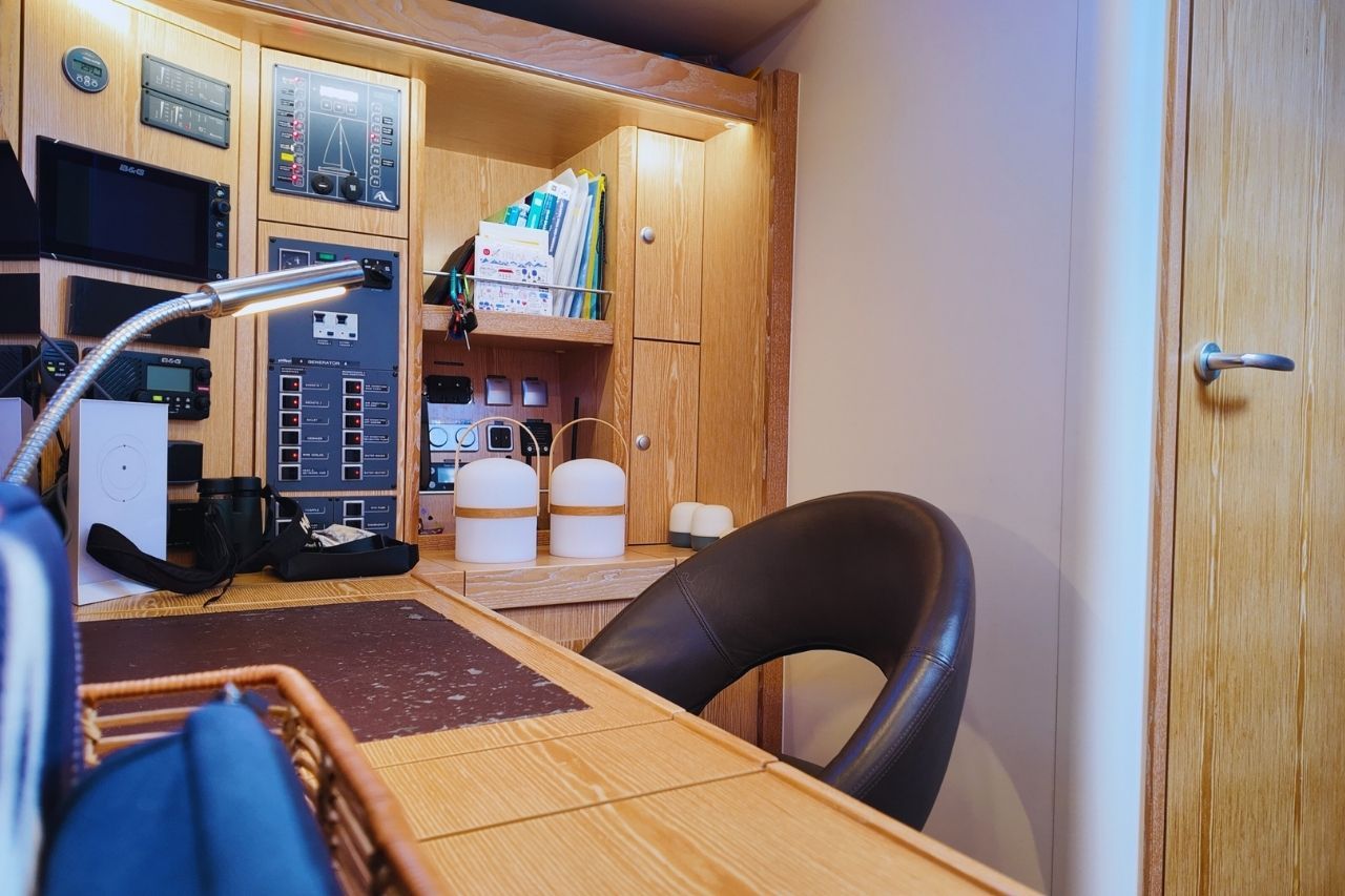 From her Elvstrom Blue Water Runner and storm sail to a thoughtfully outfitted interior including a wine cooler and full galley upgrades, she’s been prepared for long-range cruising in comfort. Power and control come from the Volvo Penta D3-110 with retractable bow and stern thrusters, while electric halyard winches, water maker, and upgraded generator support independence at sea.
