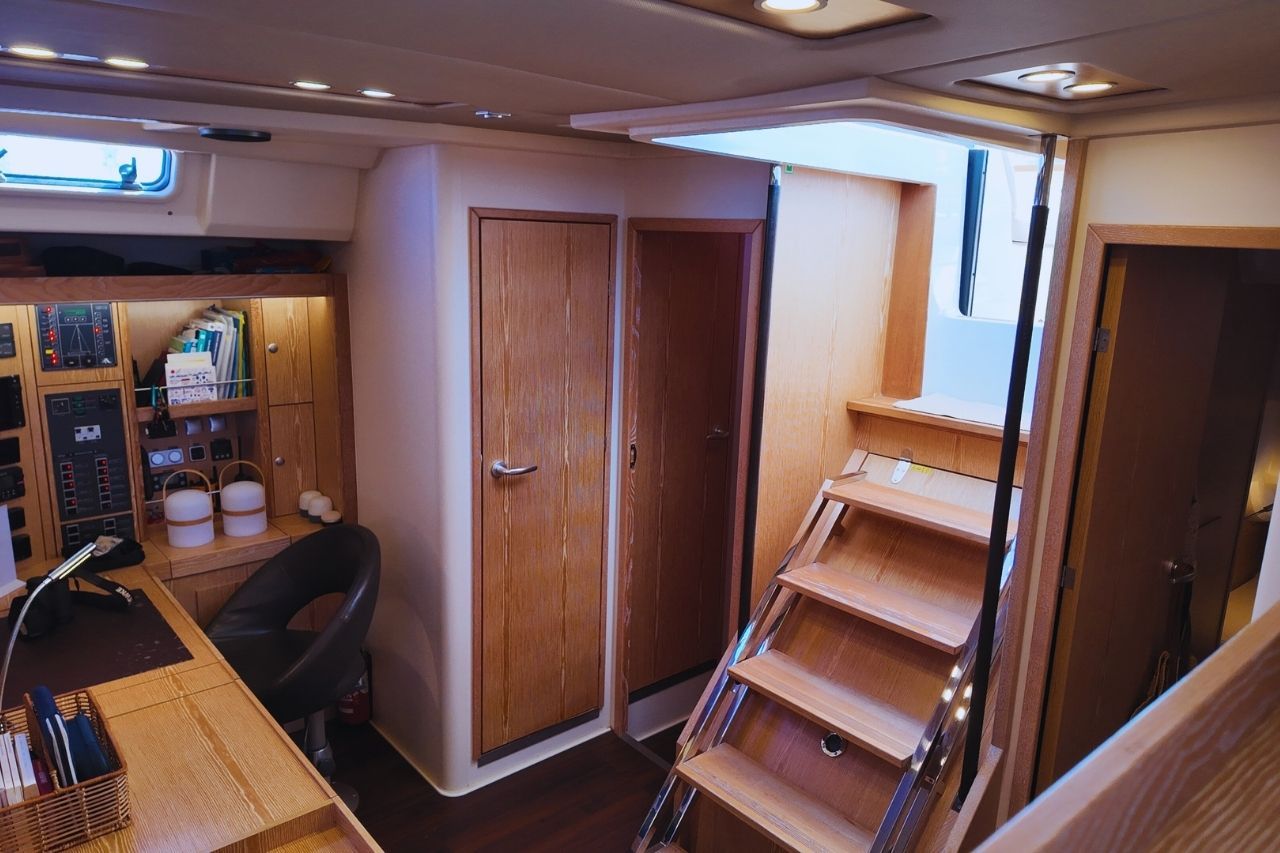 From her Elvstrom Blue Water Runner and storm sail to a thoughtfully outfitted interior including a wine cooler and full galley upgrades, she’s been prepared for long-range cruising in comfort. Power and control come from the Volvo Penta D3-110 with retractable bow and stern thrusters, while electric halyard winches, water maker, and upgraded generator support independence at sea.