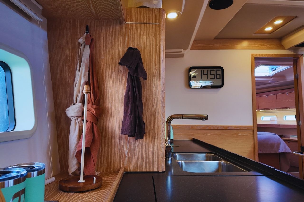 From her Elvstrom Blue Water Runner and storm sail to a thoughtfully outfitted interior including a wine cooler and full galley upgrades, she’s been prepared for long-range cruising in comfort. Power and control come from the Volvo Penta D3-110 with retractable bow and stern thrusters, while electric halyard winches, water maker, and upgraded generator support independence at sea.
